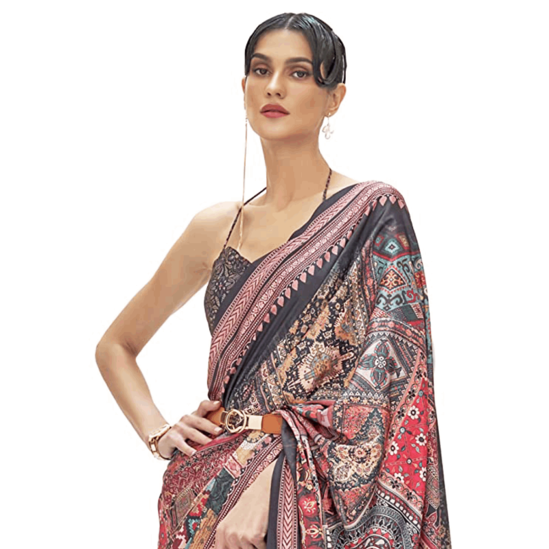 AKHILAM للسيدات كالامكاري كريب طباعة رقمية ساري مع قطعة بلوزة غير مخيط