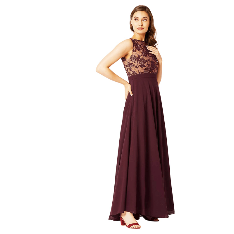 النسيج: جورجيت. بلا أكمام، ياقة مستديرة، تفاصيل دانتيل، سحاب جانبي وزر خلفي للإغلاق، منسوج