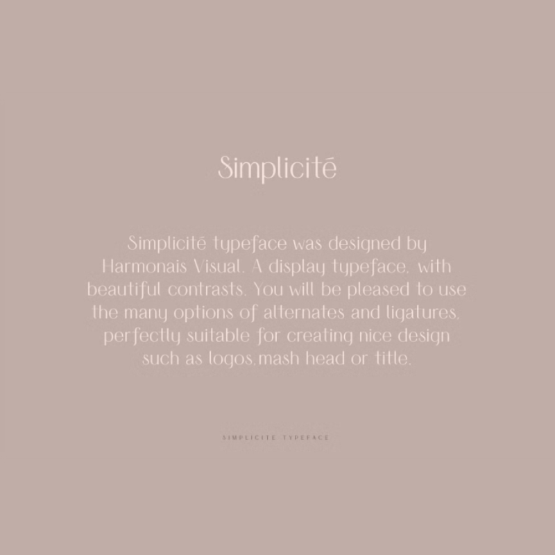 تم تصميم محرف Simplicité بواسطة Harmonais Visual. محرف عرض ، مع تباينات جميلة. سيكون من دواعي سرورنا استخدام العديد من الخيارات من البدائل والأربطة ، وهي مناسبة تماما لإنشاء تصميمات جميلة مثل الشعارات أو رؤوس الهريس أو العناوين.