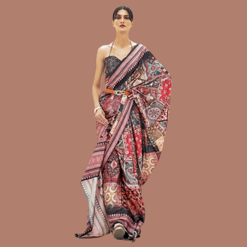 AKHILAM للسيدات كالامكاري كريب طباعة رقمية ساري مع قطعة بلوزة غير مخيط
