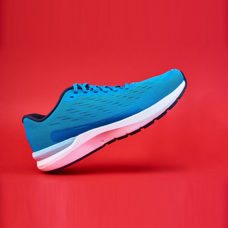 زوج من أحذية المشي الزرقاء ، مع تصميم منتظم ، تفاصيل الأربطة