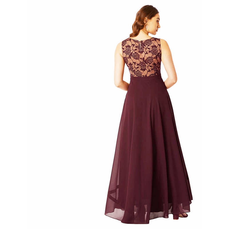 النسيج: جورجيت. بلا أكمام، ياقة مستديرة، تفاصيل دانتيل، سحاب جانبي وزر خلفي للإغلاق، منسوج