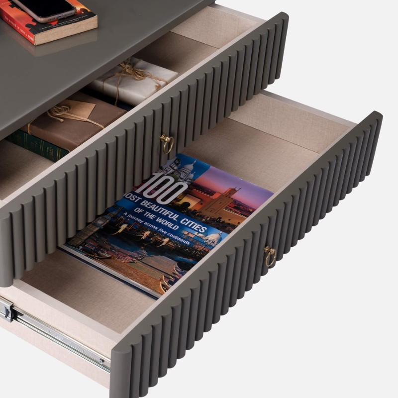 • Base masterfully crafted of premium engineered wood in beige-grey lacquered polish.